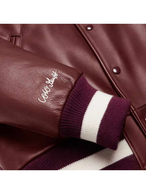 The jacket is inspired by one of tennis’s most stunning young stars, Coco Gauff. She not only displays athletic talent but also holds a strong personal style. Gauff’s jacket is unique due to its custom nature and specific details. It’s apart from typical sportswear or everyday outerwear. This charming burgundy varsity-style jacket is made from top-notch genuine leather. Ensuring both durability and a polished appearance. The classic button closure creates a vintage flair, making it adaptable for laid-back outings.