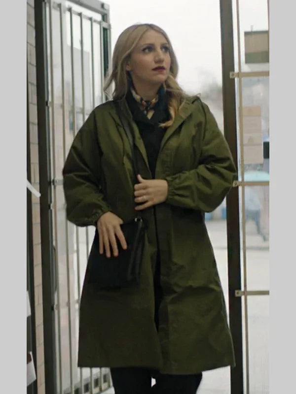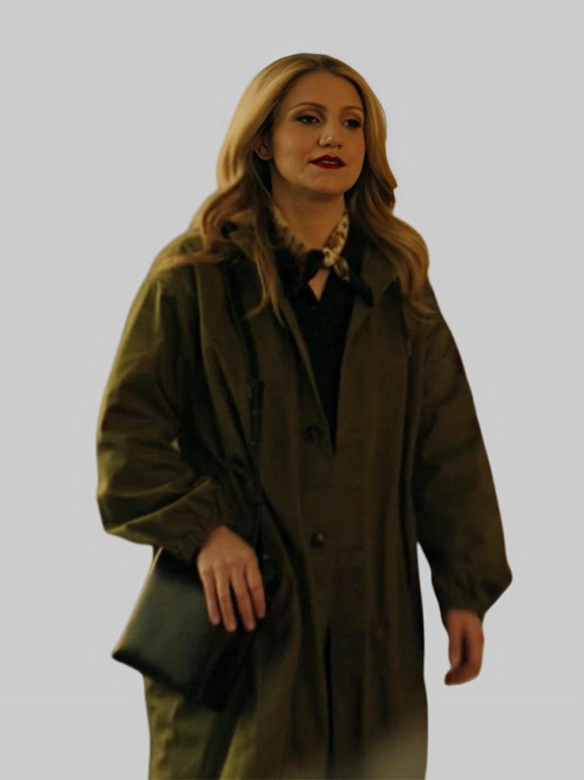 Happy Face Green Annaleigh Ashford Coat is packed with emotion, intensity, and situation-readiness. See for yourself how much strength it adds to the courageous role of Melissa and makes her stand out from the dark and dingy trope of the series.