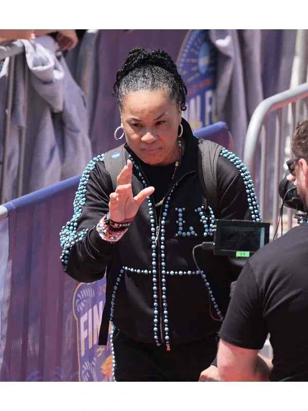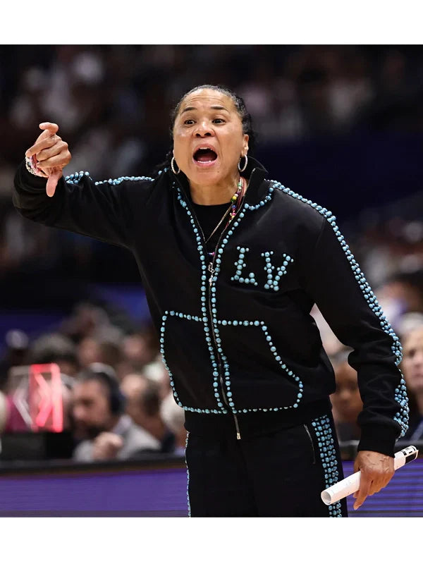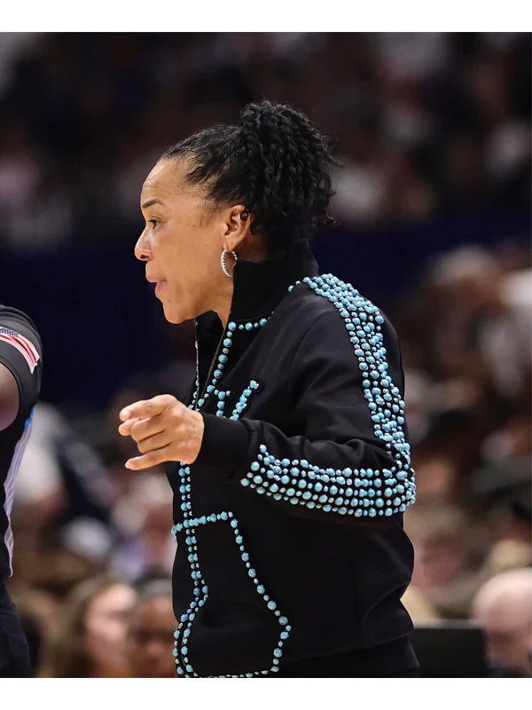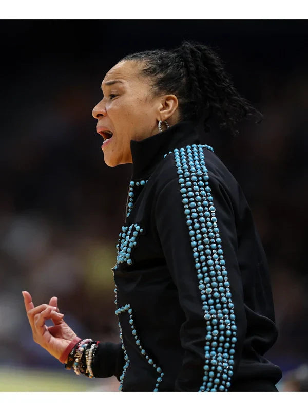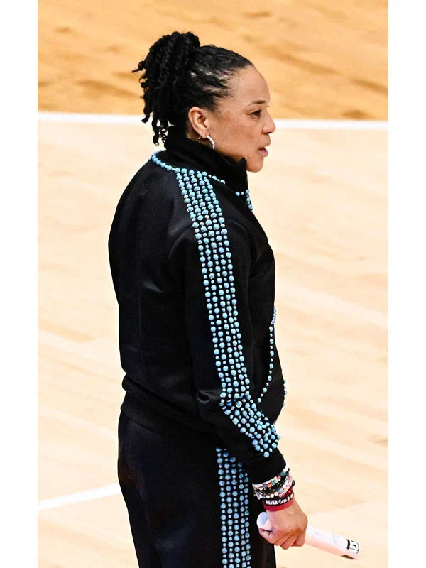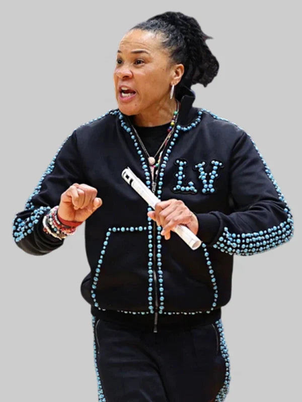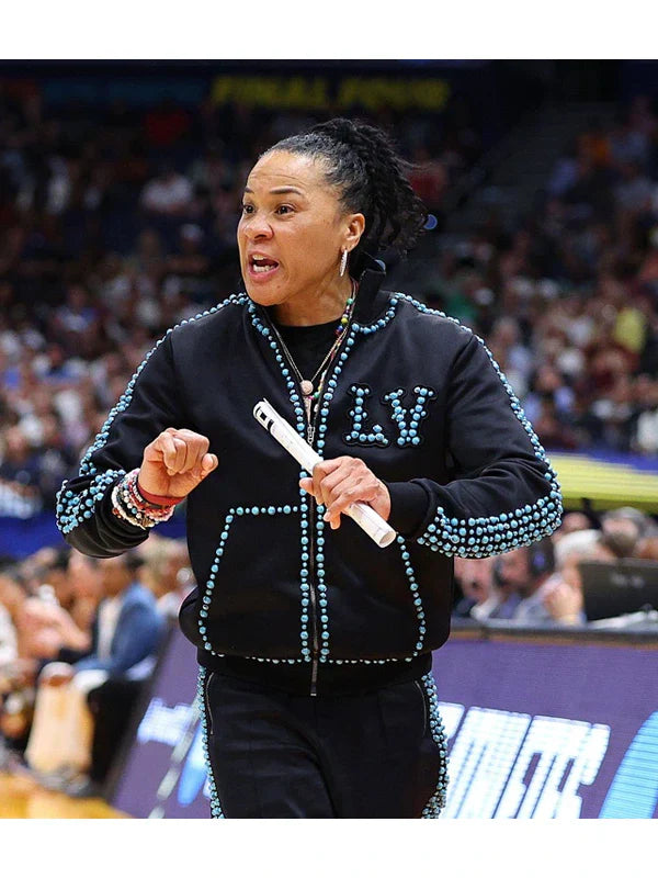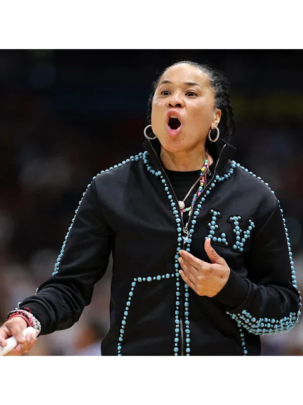 You know, it is not the first time that the South Carolina Head Coach revealed her fashion fetish for LV. She has been showing her penchant for Louis Vuitton for a long time, and every year it is something new at the courtside. Something new, exciting. Something like this LV Jacket.