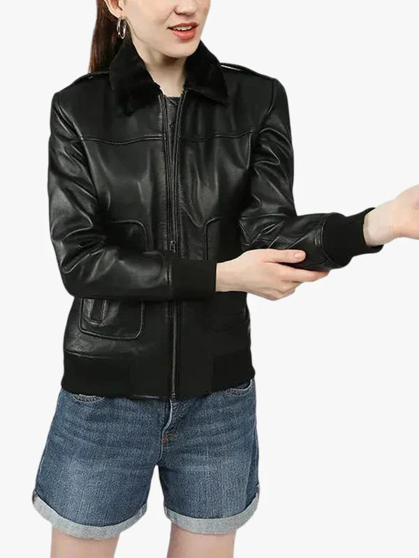 Gemma Black Bomber Leather Jacket with Original Fur Collar For Women’s