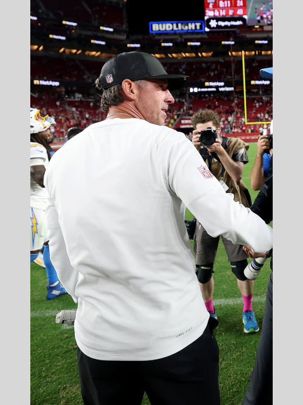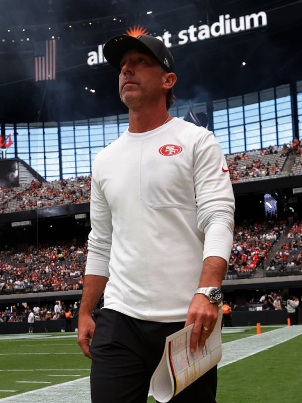 This modish capsule is meant to be styled in inspiration from Coach Shanahan. It reflects the intensity, confidence, and a player’s focus. As part of the 49ers legacy, the design of this shirt is made for functionality and team identity. Kyle Shanahan wore this shirt, fulfilling the core purpose of its making. Comfort on the sideline for prolonged periods and team unity. The garment features the San Francisco 49ers logo and colors, showcasing team pride. Moreover, it presents team branding along with the style preferences of a coach.