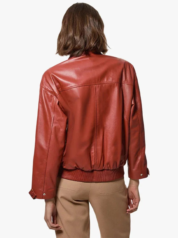 Leather Cargo Pocket Red Bomber Jacket For Women’s