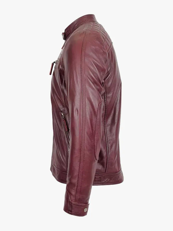 Stand Collar Real Lambskin Burgundy Leather Biker Jacket For Men’s