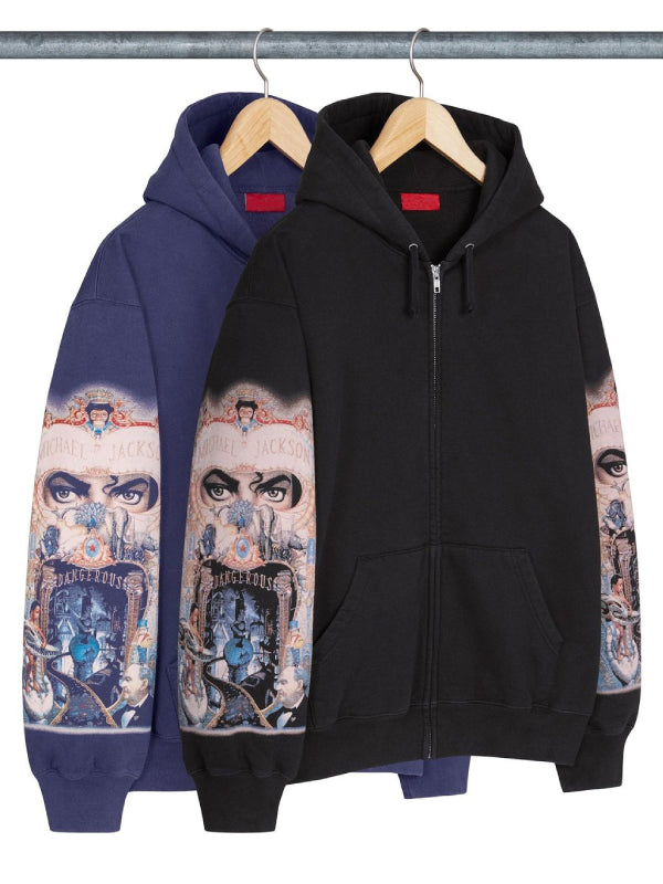 This new generation legendary outfit is recreated by our designers in premium quality fleece that promises comfort and durability. With its availability in black and blue colors, the Supreme Michael Jackson Dangerous Zip-Up Hooded Sweatshirt has undeniable appeal. This brushed-back fleece hoodie comes with a super useful zipper closure, which is perfect for your indoor and outdoor movement. The hooded collar provides plush comfort and instantly elevates your streetwear aesthetic look. Moreover, this outfit features the iconic embroidered Supreme logo on the neck and distinct sleeve prints coming from MJ’s iconic Dangerous album.