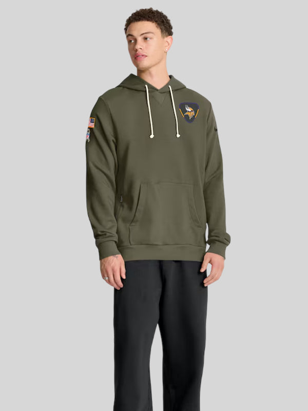 The Nike 2025 Salute to Service Vikings Hoodie Olive Green is definitely something that goes perfectly with NIKE’s Off-Beat footwear and NFL Draft Pick helmet.