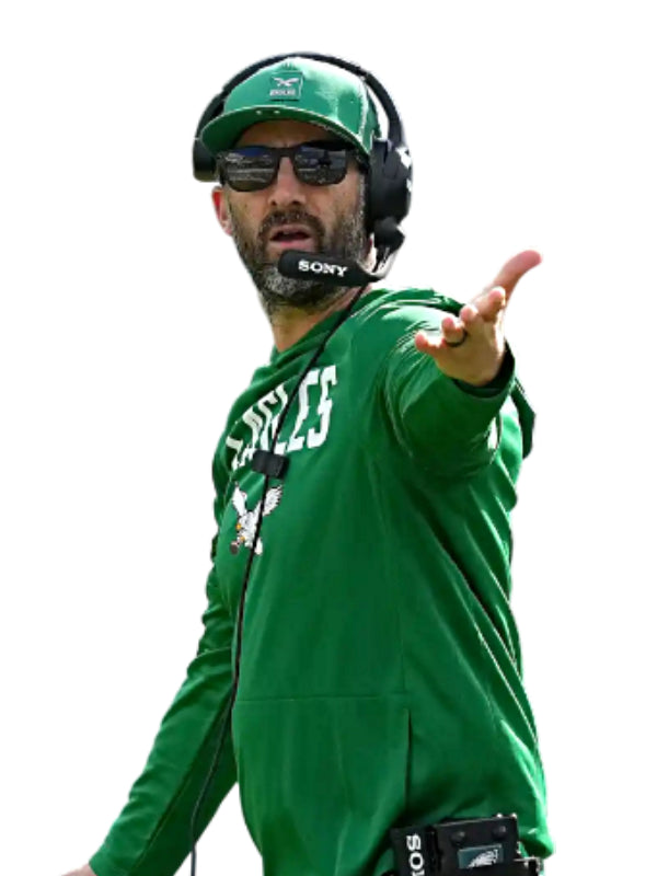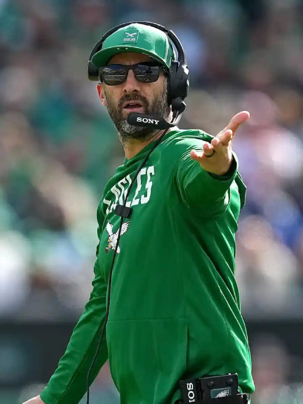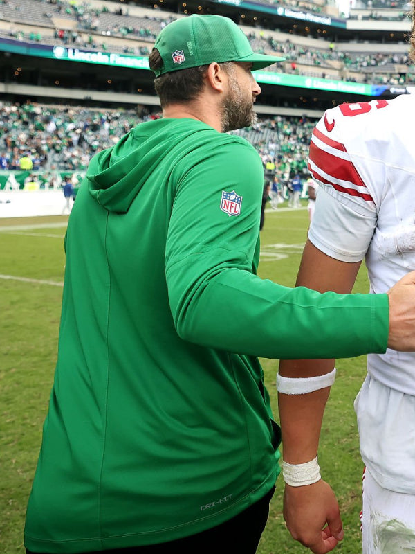 Here is the ultimate all-rounder for the field that turns every moment into a hallmark. We are talking chaos and clamor are branded with the proud details of Philadelphia Eagles in the form of a Dri-Fit Long Sleeve Hoodie T-shirt. Spec sheet is like stat sheet when it comes to this. Real ones can’t get their eyes off of the Lincoln The Eagle mascot that is neatly placed at the centre-front of it along with the lettering EAGLES which sets the priorities straight. Having a hard time figuring out what it is? The Nick Sirianni Kelly Green Eagles Long Sleeve Hoodie T-Shirt in green is a Kelly Green Philadelphia Eagles hoodie worn by coach Nick Sirianni of Philadelphia Eagles, so know that the Philly pride runs deep when the entire crowd from the Philadelphia Eagles side packs the stadium with this lean and green hoodie t-shirt that is made for the true fans like yourself.