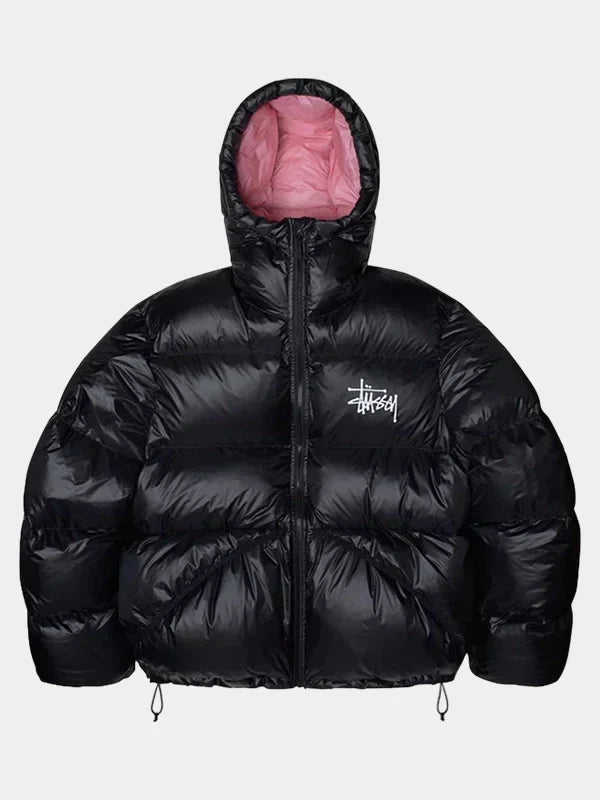 Our study puffer jacket is black on the exterior and pink on the exterior. The Puffer Jacket Stüssy is less…effortless.