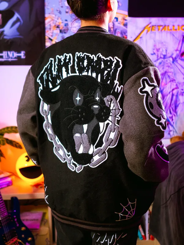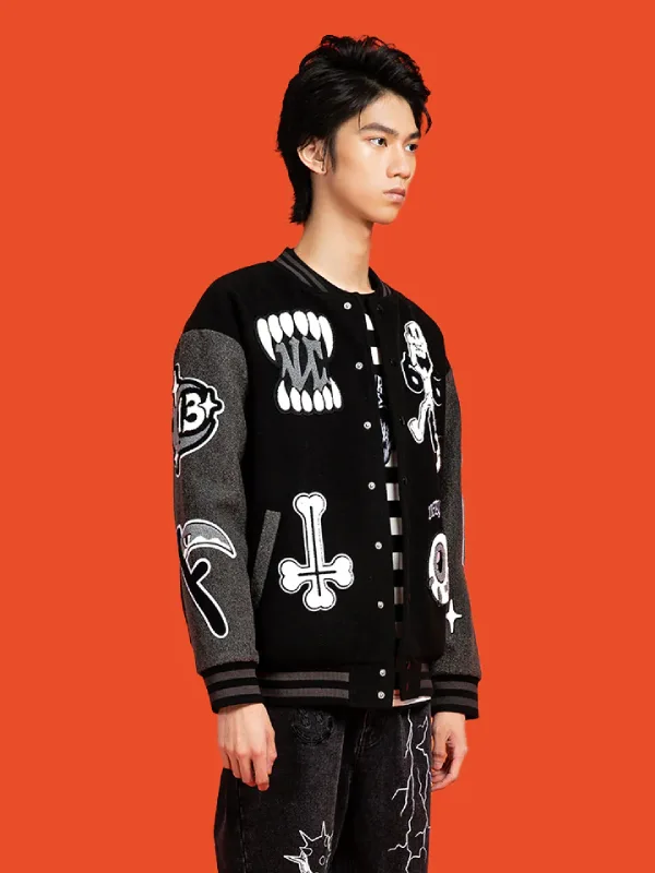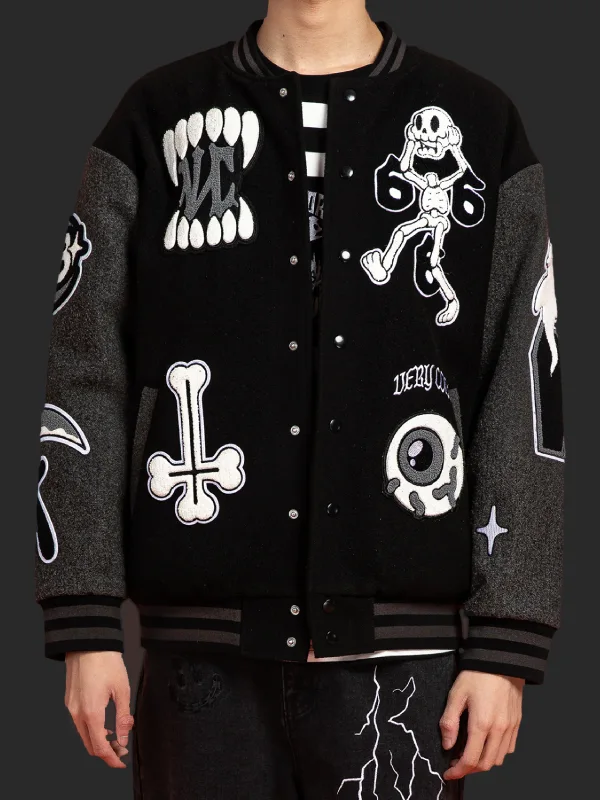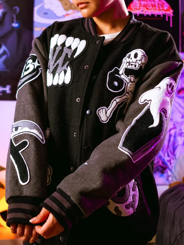 Animated varsity details are emblazoned like appliqué. All halloween-ready details that also get the hall pass for making an awesome fashion statement across the campus. For excellent silhouette management, count on the contrasting ribbed cuffs and hemline that keep the outerwear glued to your wrists and hemline, and do you know what else? Like most authentic varsity jackets, the Play Cruel Very Cool Varsity Jacket comes with snap tab buttons that are easier to work with, offering you the perfect balance between traditional buttoned closure and zipper front.