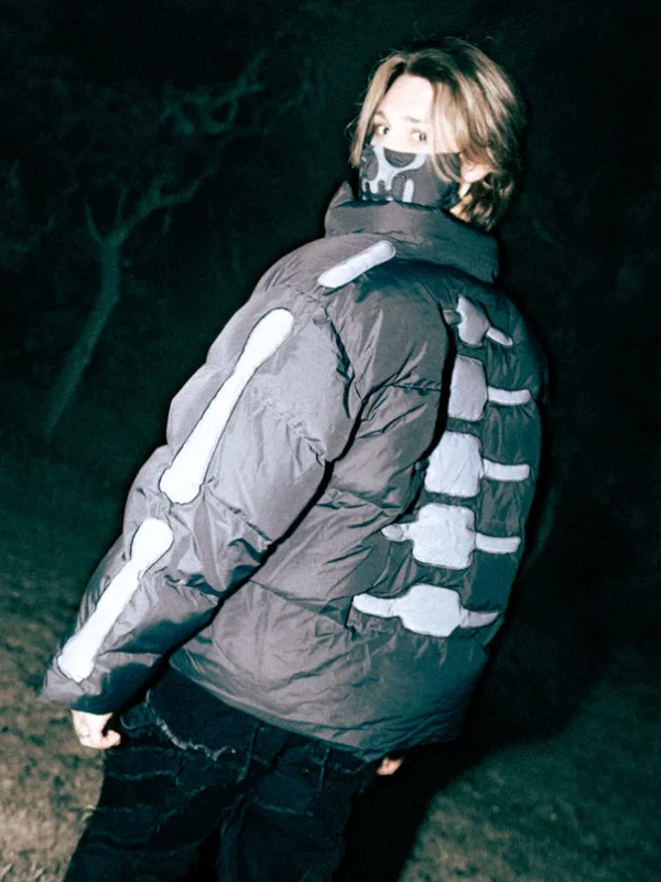 Looking at the back, we see a spine that your wardrobe needs to grow. 100% duck down filling is what to expect from an authentic puffer jacket with two internal pockets, black reflective bone details that are like pirate and adjustable hem toggles, and did you notice the bone details on the sleeves? Pretty cool for a puffer jacket, right?