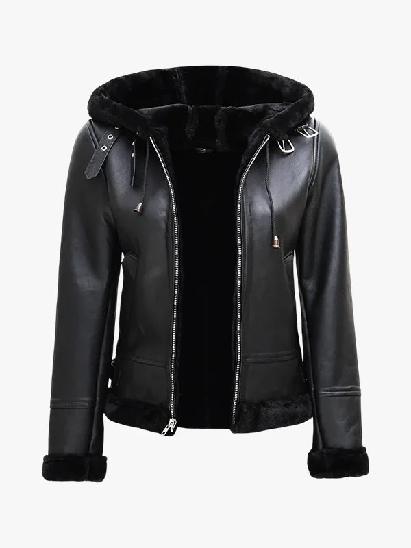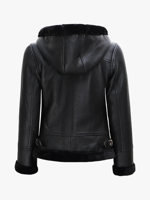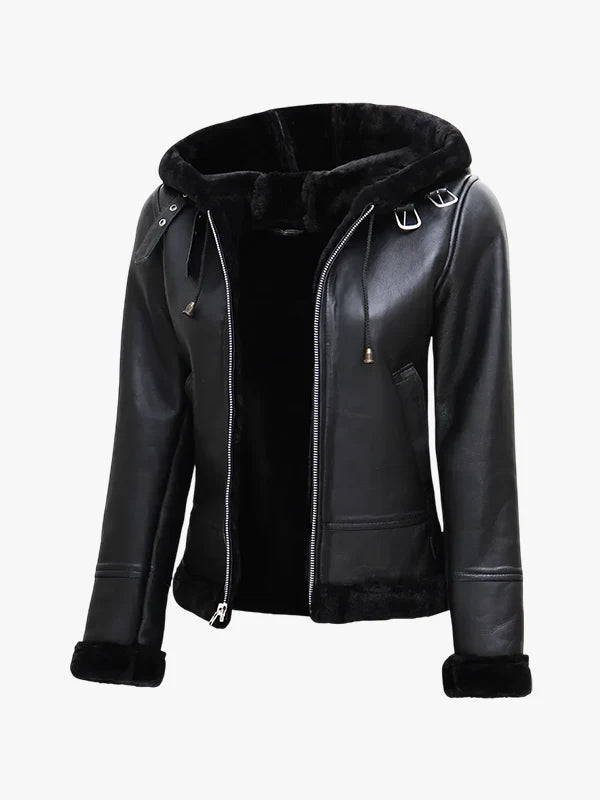 Women's Black Leather Hooded Shearling Jacket