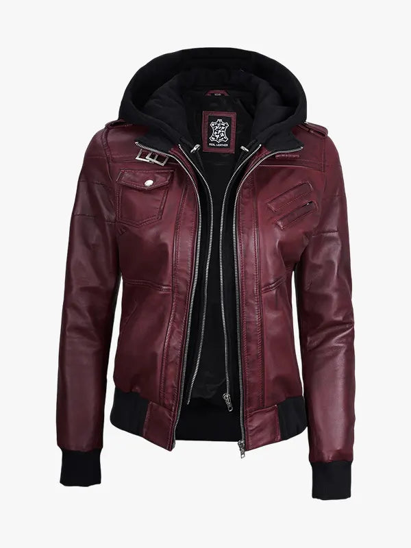 Be the first to review “Women’s Burgundy Leather Jacket with Removable Hood” Cancel reply