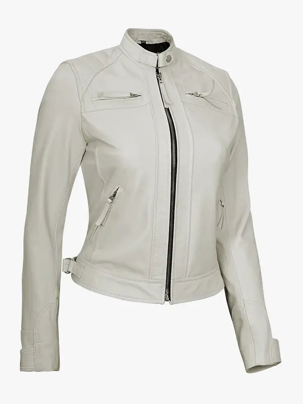 Womens Real Lambskin Leather Off White Quilted Biker Jacket
