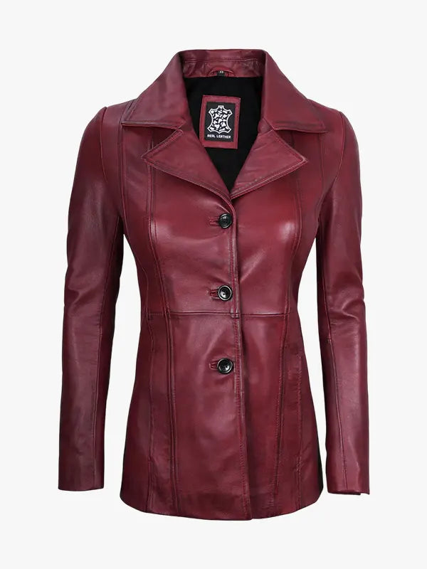 Women’s Real Leather Burgundy Blazer with Three Button