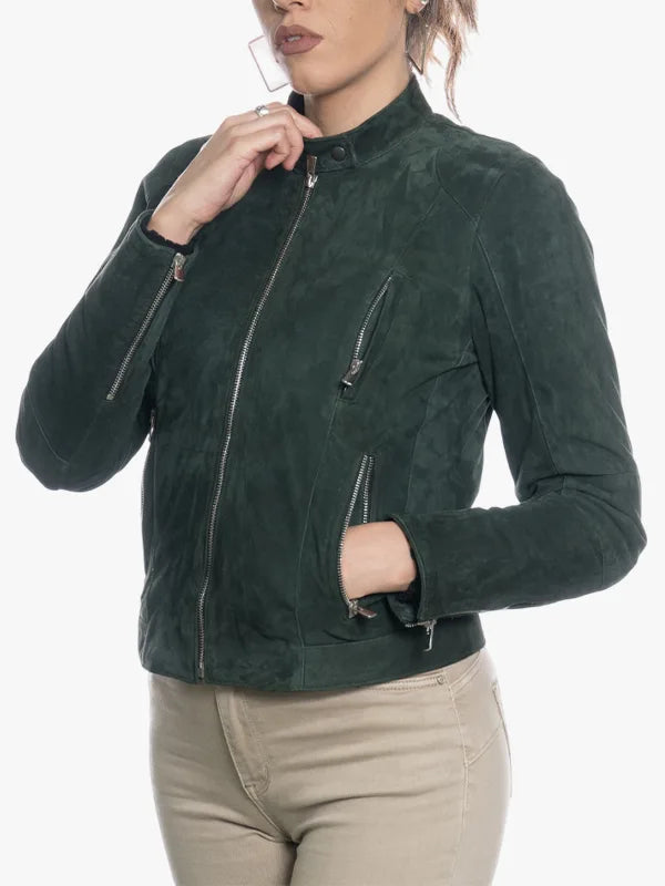 Zara Bis Green Suede Zipper Jacket in Genuine Leather For Women’s